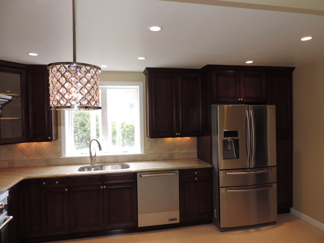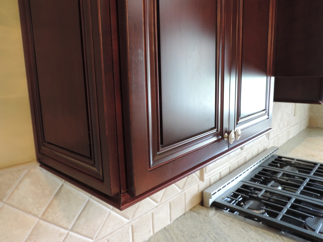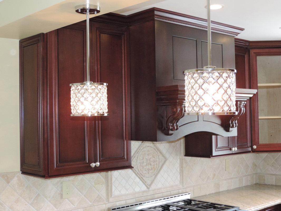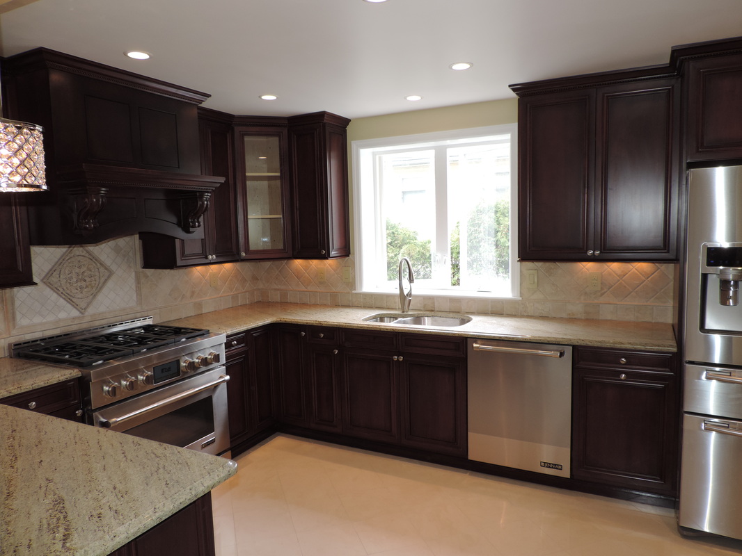 This luxurious kitchen showcases the rich elegance of Black Cherry custom cabinetry, blending timeless craftsmanship with modern functionality. Deep-toned cabinets with intricate molding create a bold yet refined aesthetic, perfectly complemented by soft under-cabinet lighting and a warm neutral backsplash. High-end stainless steel appliances—including a professional-grade gas range and French door refrigerator—pair seamlessly with gleaming granite countertops. Pendant lighting above the peninsula adds a touch of glamour, while the large picture window invites natural light to enhance the inviting atmosphere. A stunning example of traditional design elevated for contemporary living.