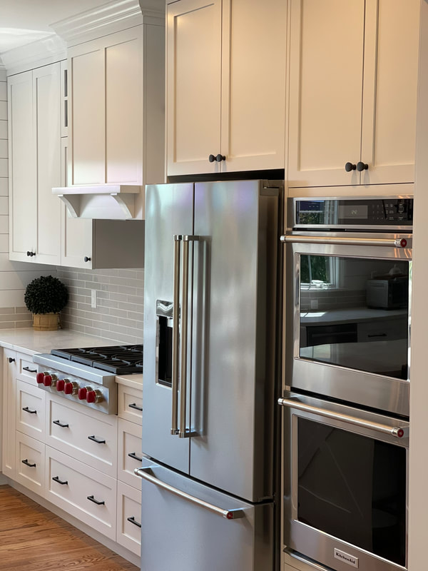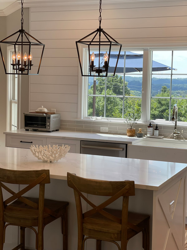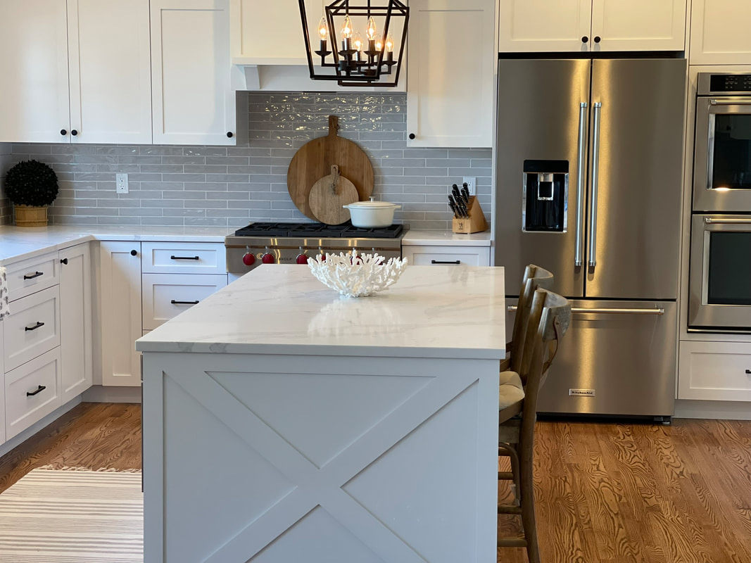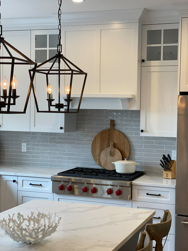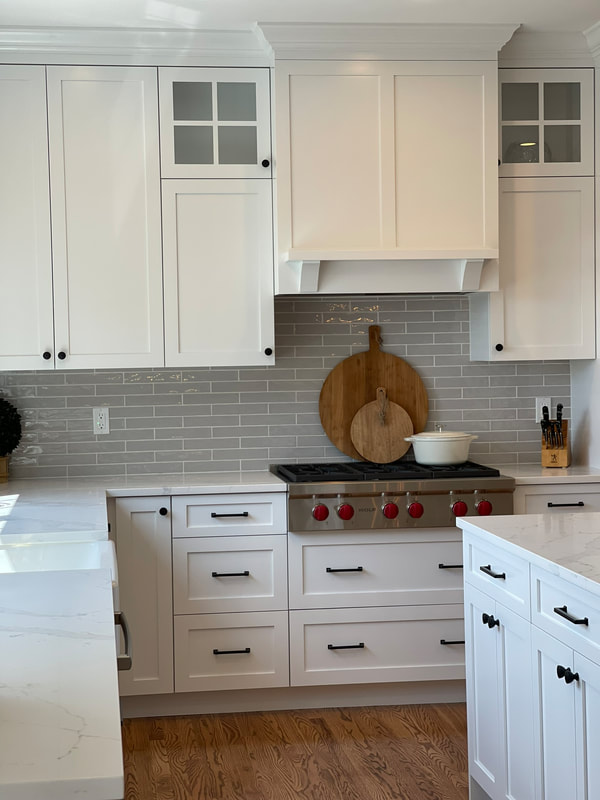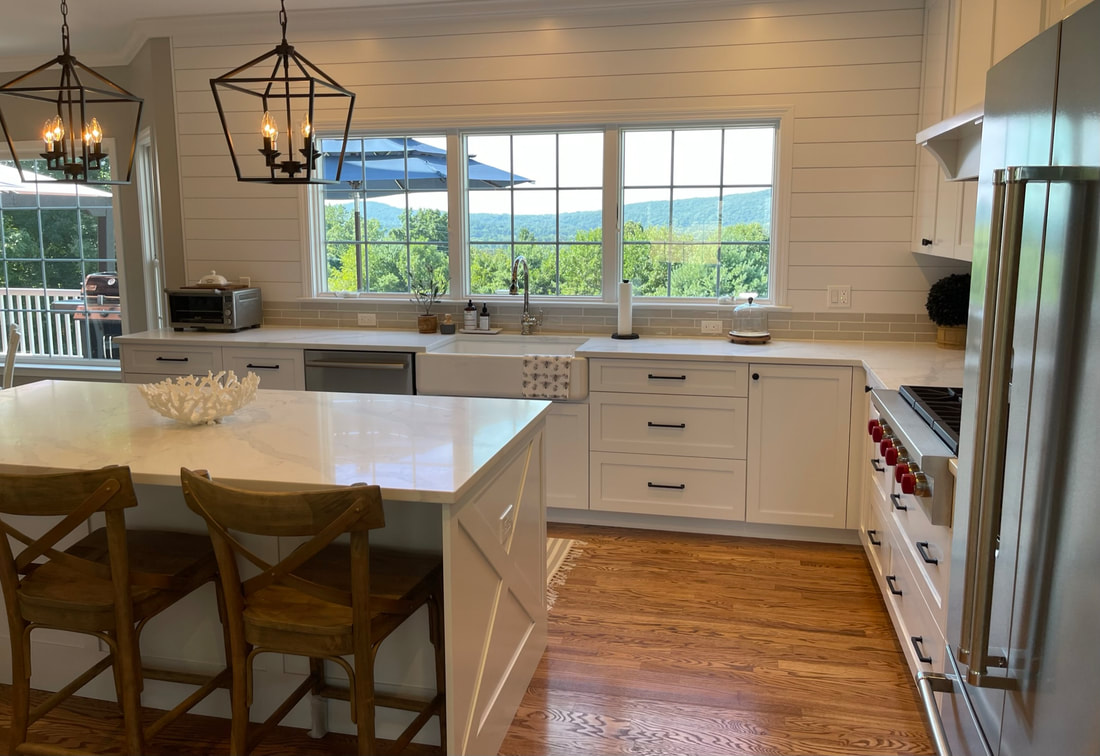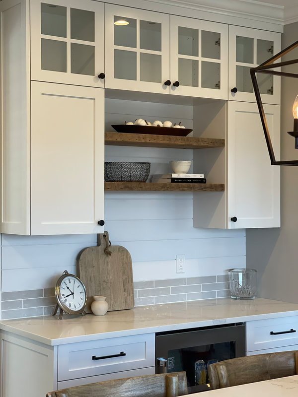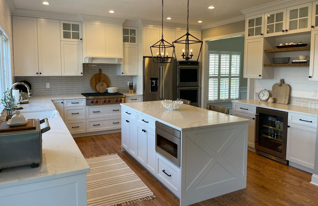 This elegant custom kitchen features a sophisticated blend of form and function. Crisp off-white cabinetry pairs seamlessly with a bold, dark island, creating a stunning contrast that anchors the space. Ample natural light enhances the bright countertops and highlights the intricate details of the cabinetry. The adjoining butler’s pantry continues the aesthetic with dark cabinetry, glass-front uppers, and efficient workspace organization. High-end appliances, modern lighting, and thoughtful storage solutions come together in a layout designed for both everyday living and entertaining.