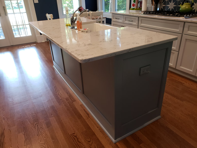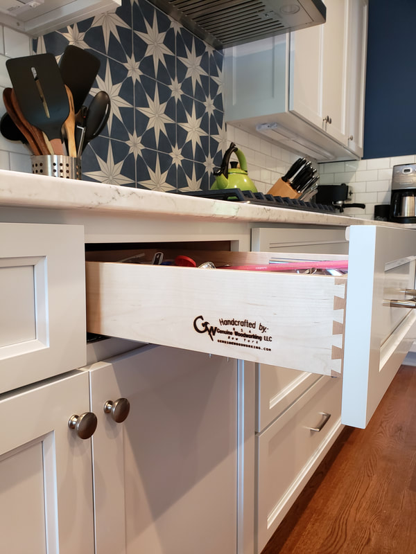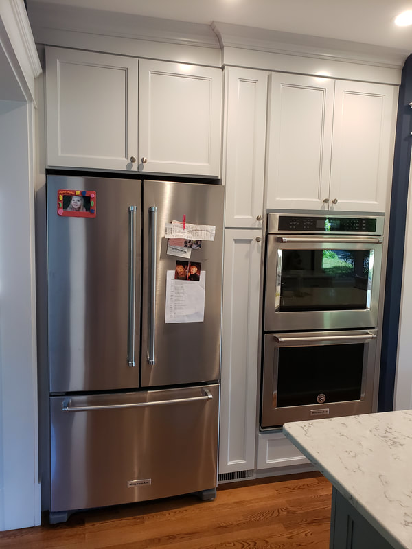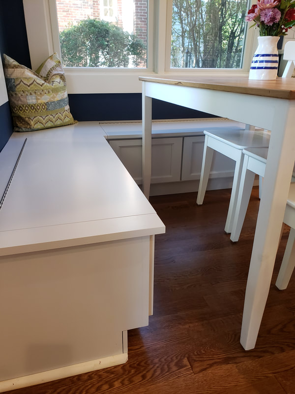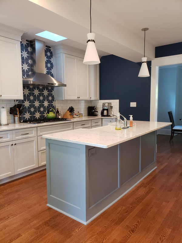 This custom kitchen combines crisp white cabinetry with a bold blue accent wall and backsplash for a striking, modern look. A cozy breakfast nook with built-in bench seating maximizes space and charm by the window, while a spacious island and sleek stainless steel appliances add both function and elegance. With natural light flooding in and thoughtful design touches throughout, this space is as welcoming as it is stylish.