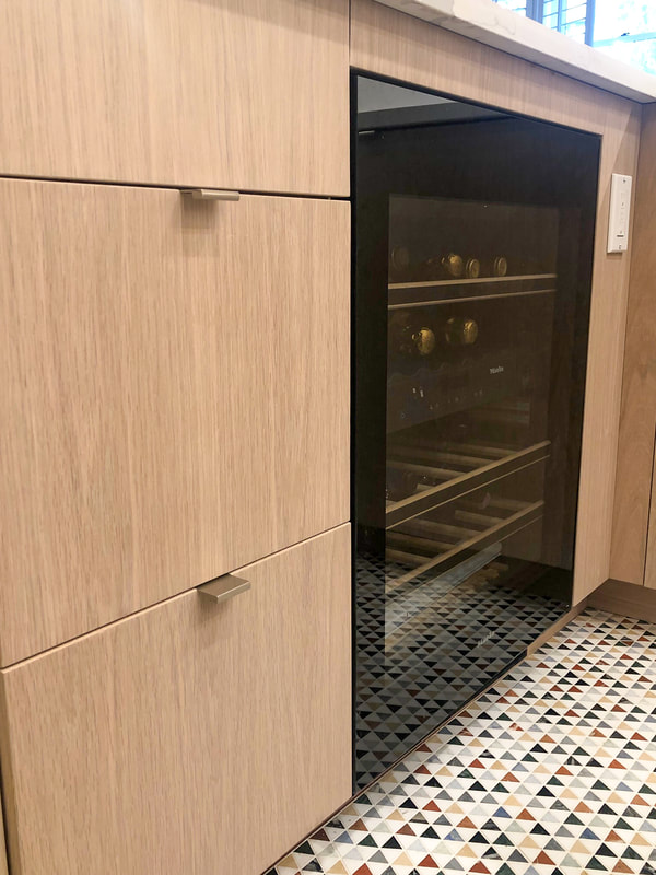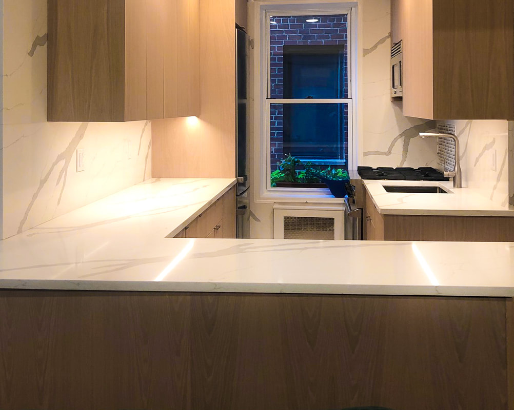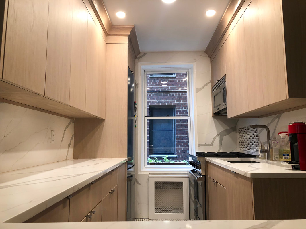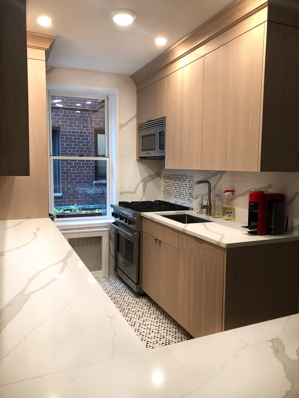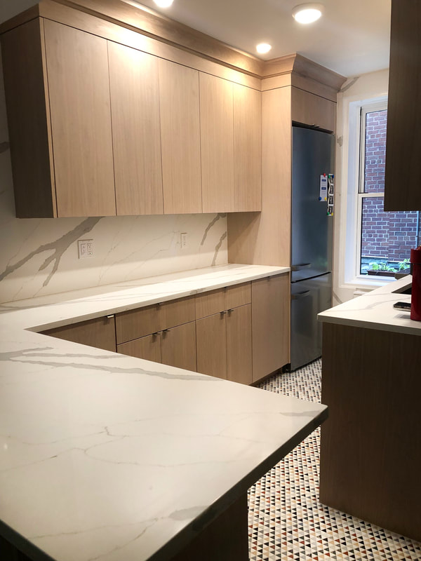 This sleek and functional galley kitchen showcases custom flat-panel cabinetry in White Oak, beautifully paired with elegant white quartz countertops and a full-height matching backsplash. The design maximizes space and natural light through integrated under-cabinet lighting and smart storage solutions. A clean tile score pattern adds subtle character, while stainless steel appliances and a built-in microwave complete the modern aesthetic.
