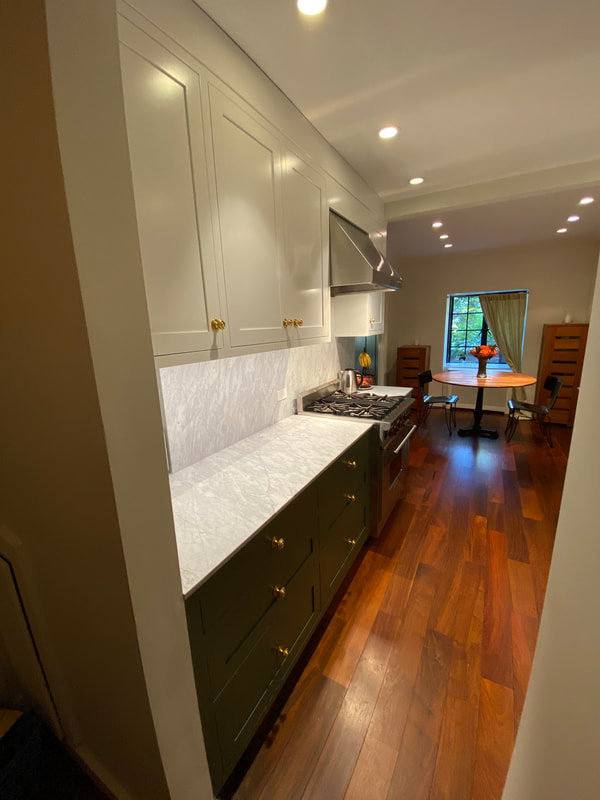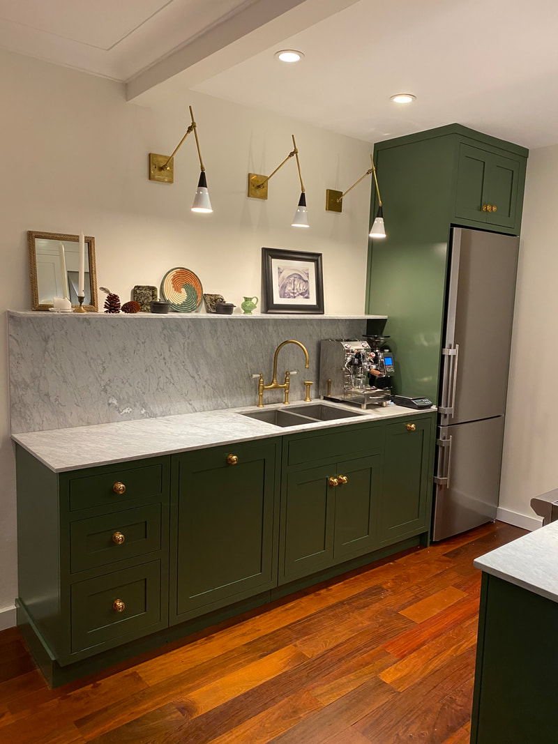 This beautifully crafted kitchen blends classic style with modern convenience. The lower cabinetry is finished in Pearl Green, accented with warm brass hardware, and topped with elegant marble countertops and backsplash. Clean-lined upper cabinets in a soft neutral tone provide a bright contrast and ample storage. Thoughtful touches such as brass wall-mounted lighting, integrated appliances, and a coffee station enhance both form and function. Paired with rich wood flooring, the space feels warm, timeless, and inviting.