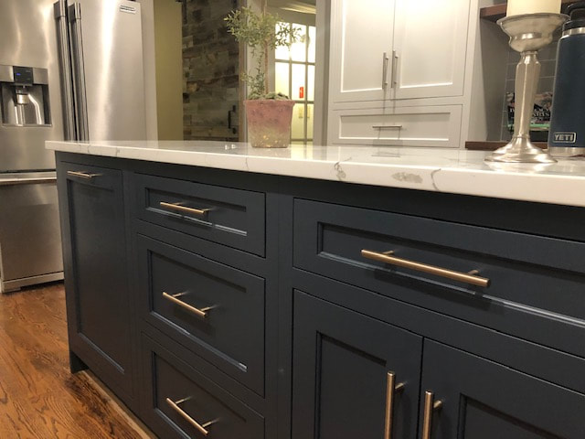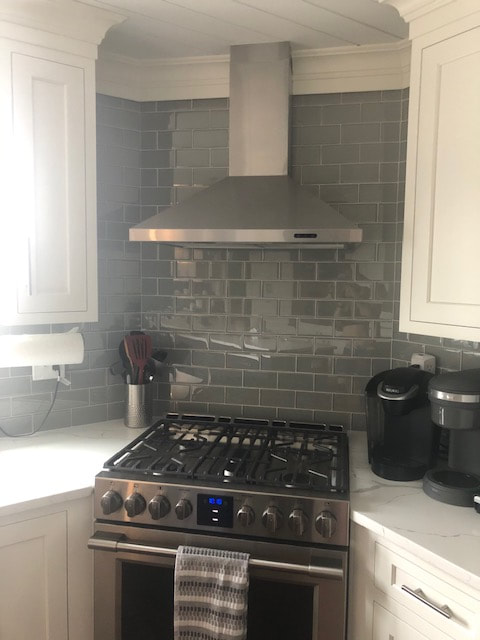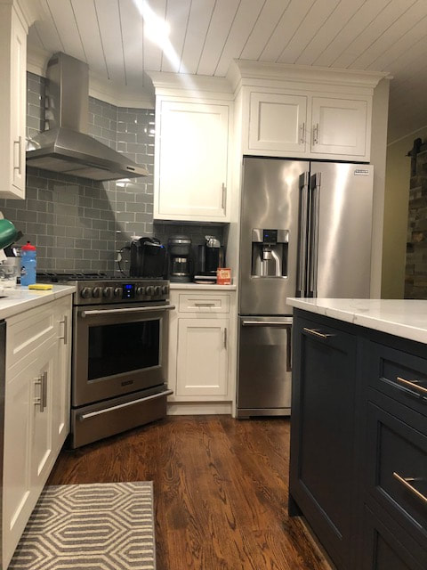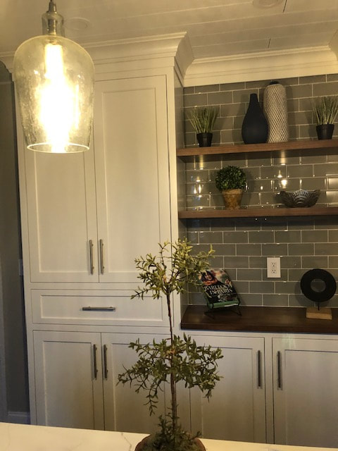 This elegant kitchen features custom cabinetry with clean shaker-style doors, extending to the ceiling for a seamless and spacious feel. Natural wood floating shelves add warmth and contrast, paired with a sleek gray subway tile backsplash. The space includes built-in appliances, a large center island with a contrasting dark finish, and modern pendant lighting to complete the transitional design. Meticulous craftsmanship and thoughtful design make this kitchen both beautiful and functional.
