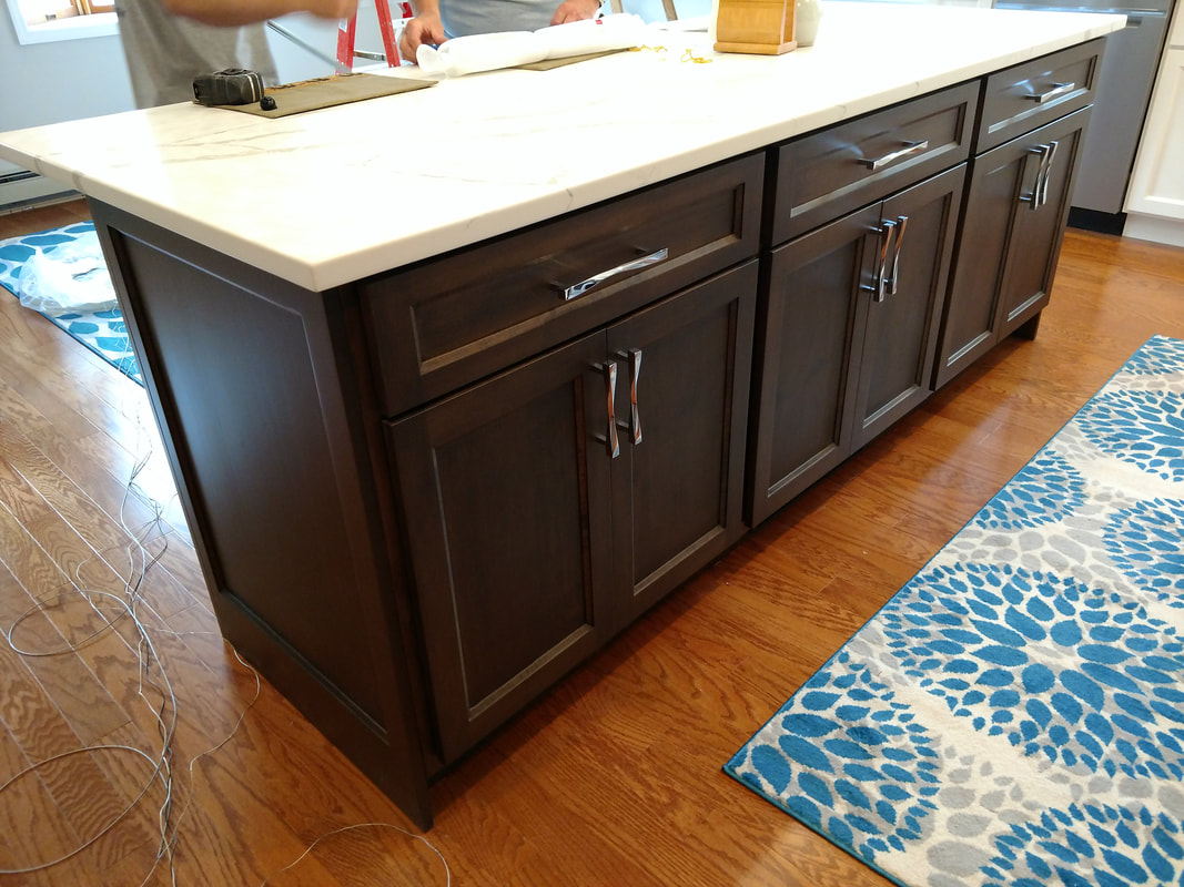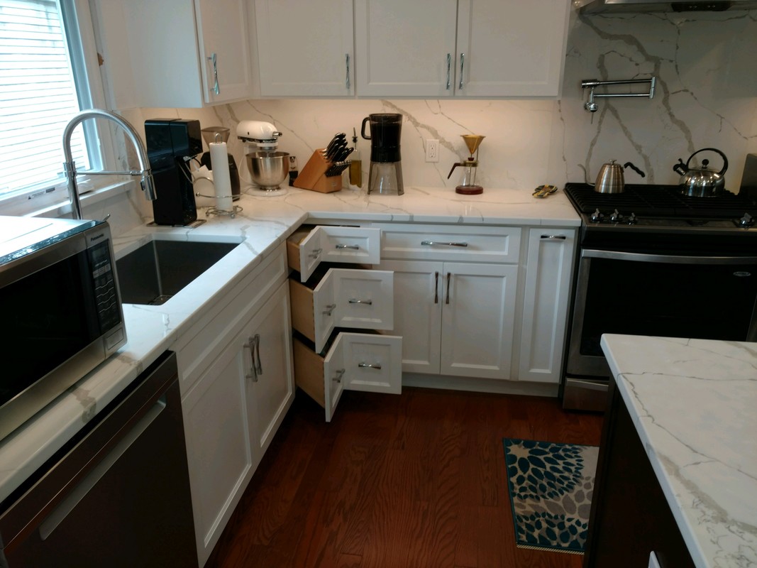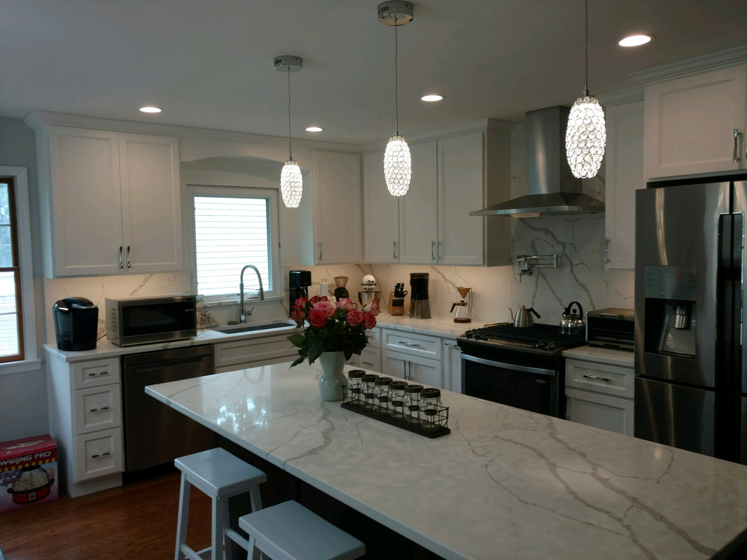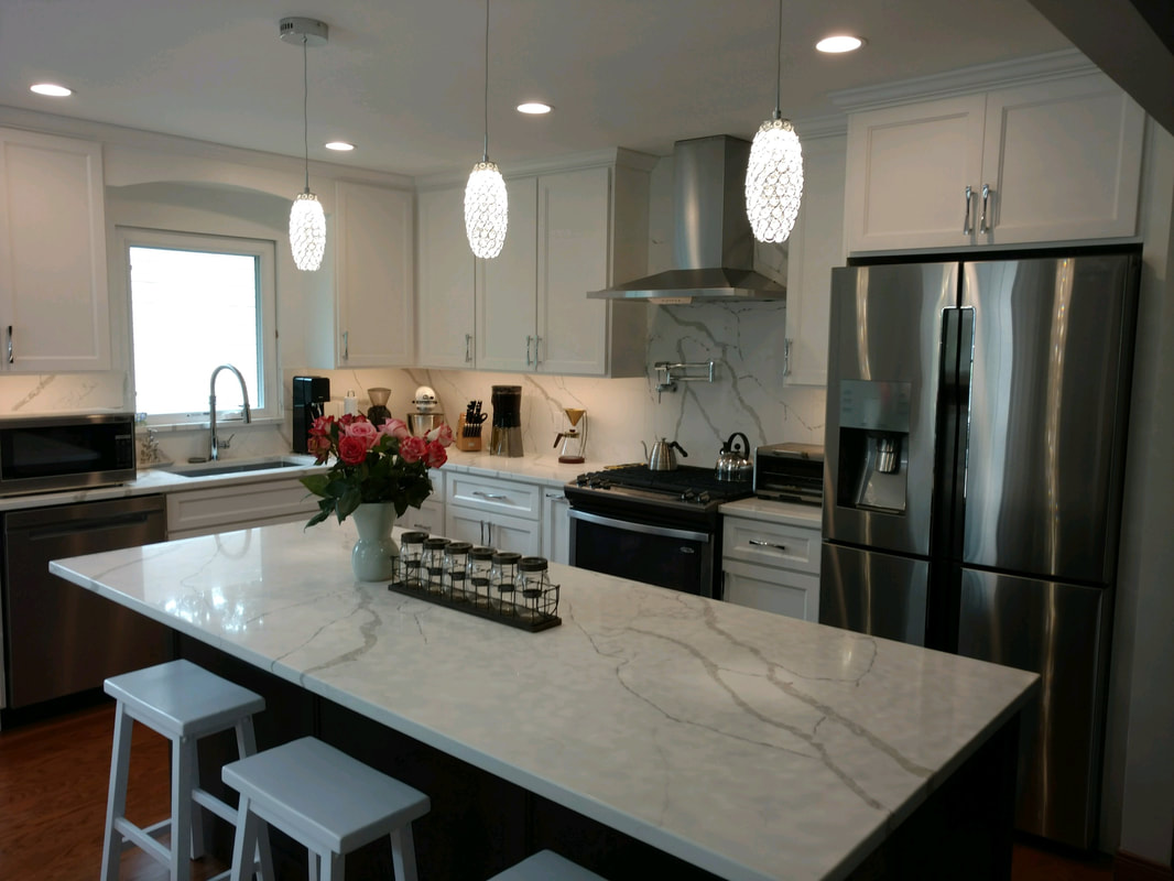 This custom kitchen blends classic charm with modern sophistication. Featuring crisp white shaker cabinets, sleek quartz countertops with dramatic veining, and polished stainless steel appliances, the space is as functional as it is beautiful. A spacious island with contrasting dark cabinetry offers ample prep space and casual seating, illuminated by striking pendant lights. Thoughtful storage solutions, including deep drawers and corner cabinetry, make this kitchen as efficient as it is inviting.