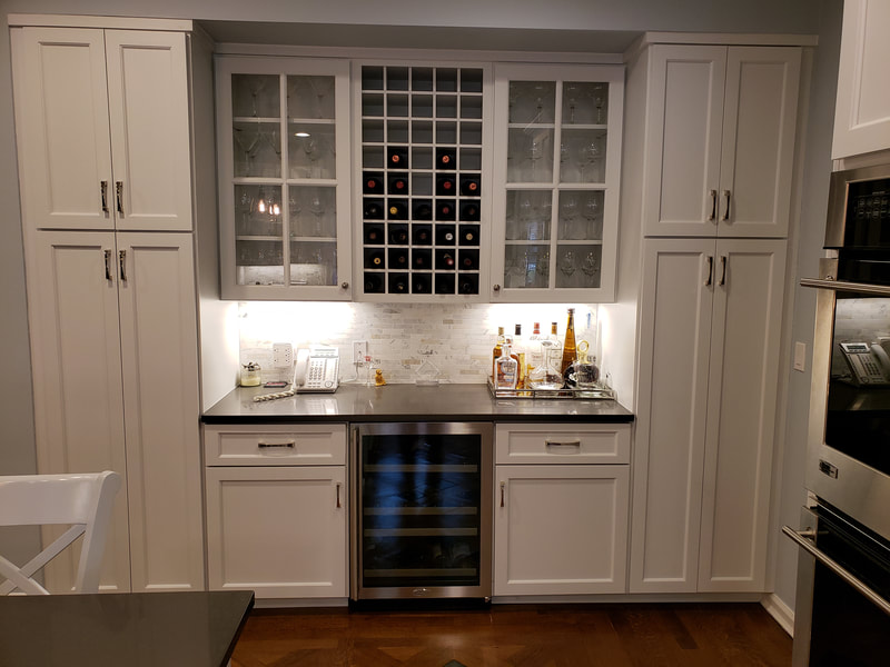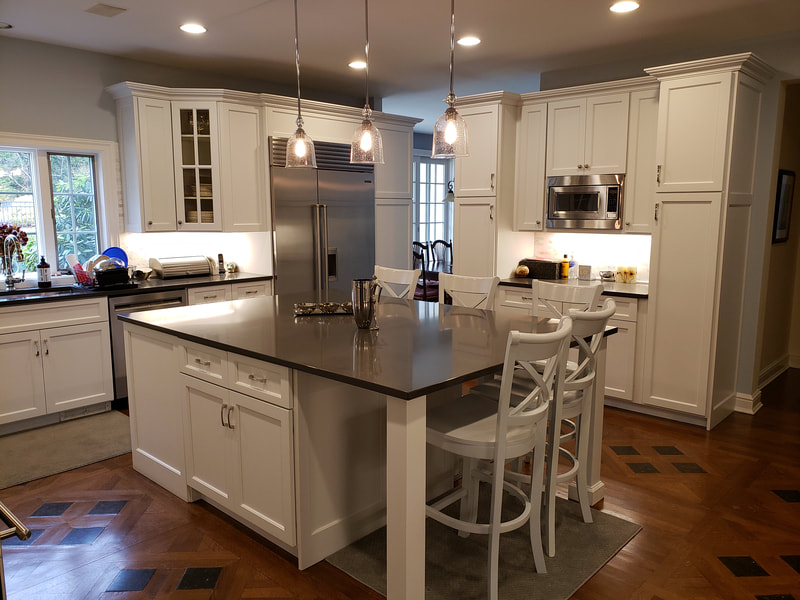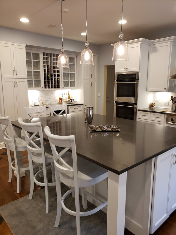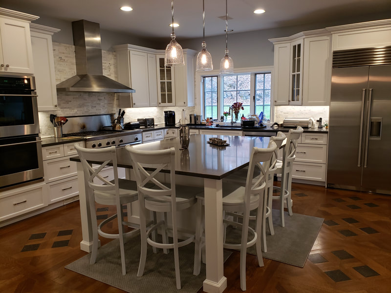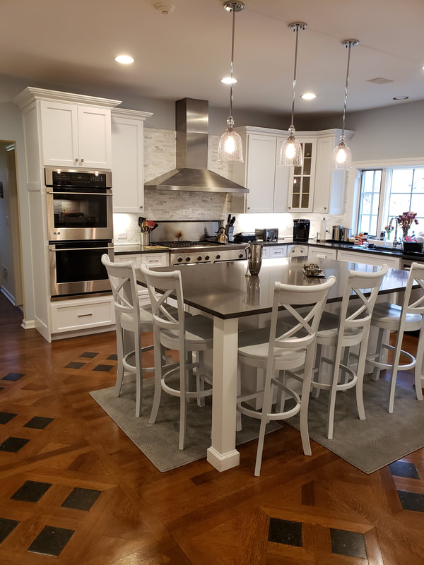 Sophisticated Chef’s KitchenThis elegant kitchen features a full cabinet reface complimented by a blend of new custom cabinetry, creating a seamless and refreshed look. The spacious island with a dark quartz countertop provides ample seating and prep space, accented by pendant lighting. High-end stainless steel appliances, including a double oven and professional-grade range with hood, elevate functionality and style. The warm wood flooring with decorative inlays adds character and contrast, while glass-front cabinets and under-cabinet lighting offer both beauty and practicality.