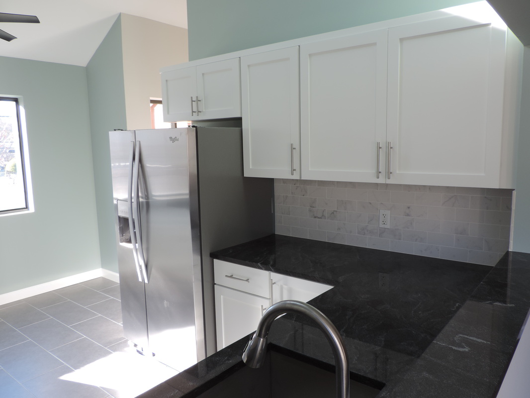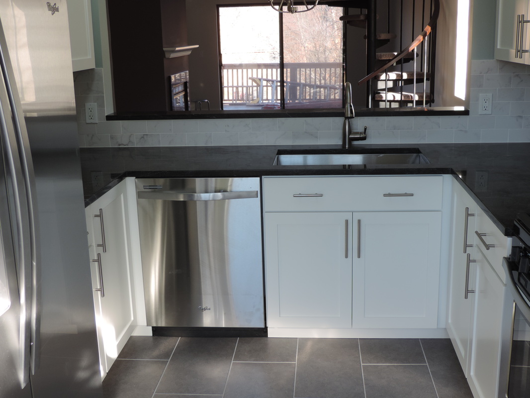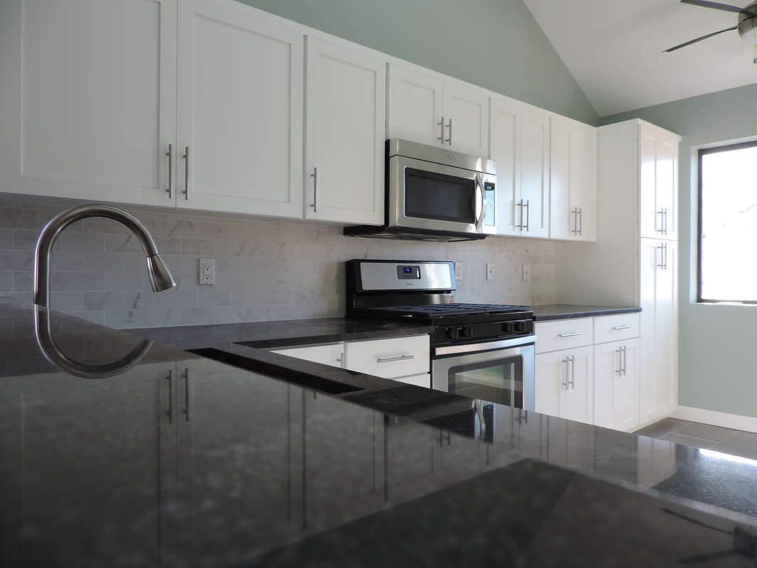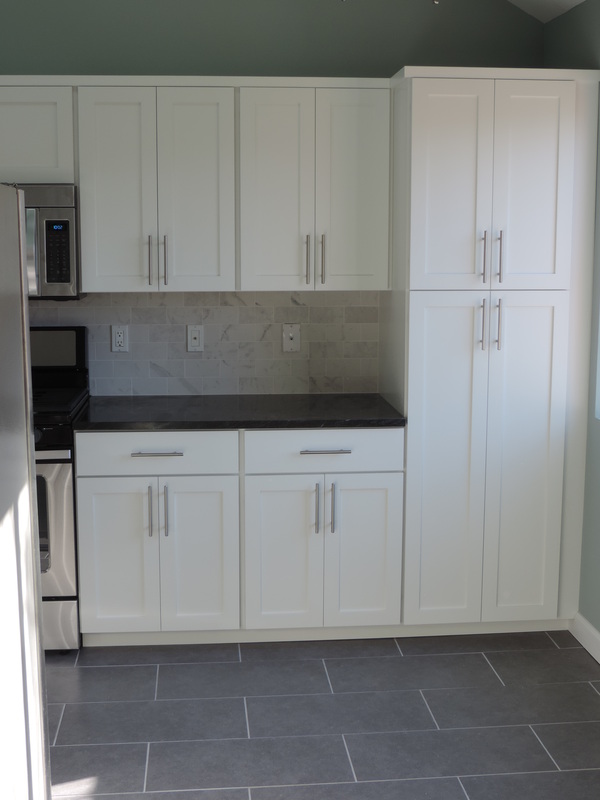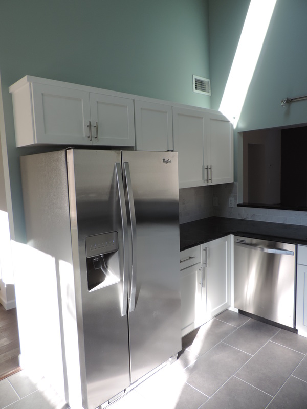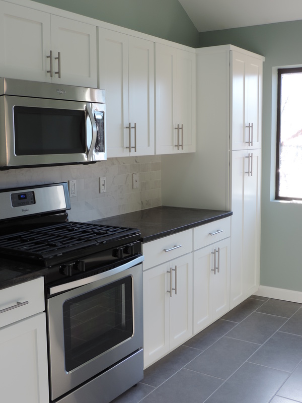 This kitchen transformation showcases a clean, modern aesthetic brought to life through a thoughtful reface. Crisp white shaker-style cabinets offer timeless elegance, while brushed nickel hardware adds a subtle contemporary touch. The charcoal gray quartz countertops and coordinating backsplash introduce contrast and depth, perfectly complemented by slate-toned tile flooring for a cohesive foundation. Stainless steel appliances, including a gas range and built-in microwave, enhance functionality and style. The open layout makes the space feel airy and inviting — a perfect blend of modern design and everyday comfort.